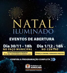 As famílias sorocabanas já podem se preparar, pois o espírito do natal tomará conta da cidade. A abertura oficial da programação “Natal Iluminado 2022” está agendada para o dia 30 de novembro, às 18h, no Paço Municipal, localizado no Alto da Boa Vista, e no dia 1 de dezembro, também às 18h, na Praça Cel. Fernando Prestes, no Centro.