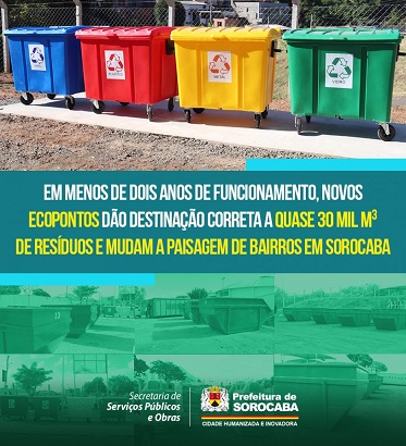 A Prefeitura de Sorocaba registrou, em menos de dois anos de funcionamento, a destinação adequada e ambientalmente correta de 28.725 m³ de diferentes tipos de resíduos, nos quatro novos Ecopontos da cidade, conhecidos como Pontos Ecológicos de Pequenos Volumes.